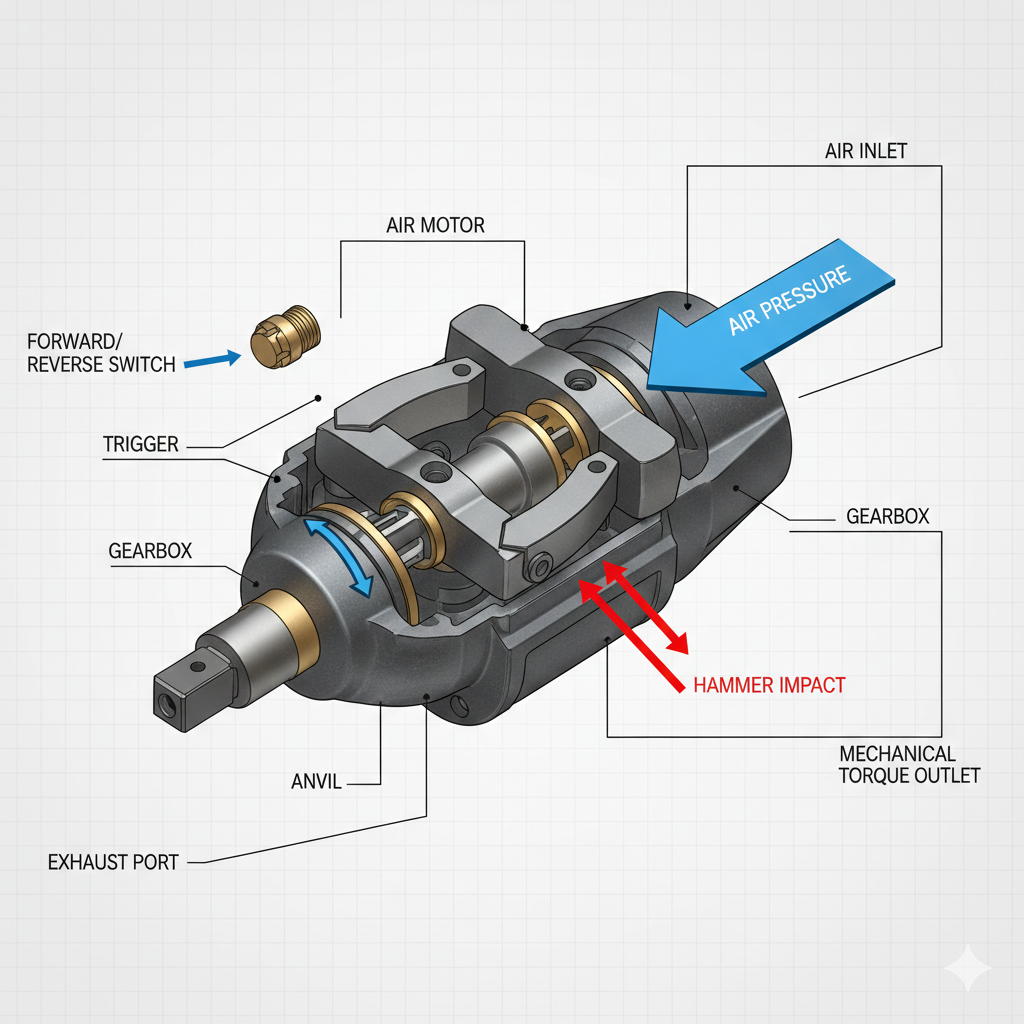 Srdce a pneumatický rázový utahovák je jeho vzduchový motor. Když uživatel stiskne spoušť, stlačený vzduch vstoupí do nástroje a roztočí rotor. Tento rotor je spojen s "nárazovým mechanismem" - obvykle s dvojitým kladivem nebo houpacím psem. Jak se rotor otáčí, vytváří kinetickou energii. Když je odpor šroubu vyšší než otáčecí síla motoru, vnitřní kladiva narazí na výstupní hřídel (kovadlinu) a vyvolají náhlý, masivní výbuch rotační síly. To se děje stovky nebo dokonce tisícekrát za minutu.